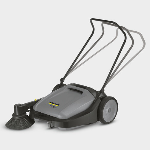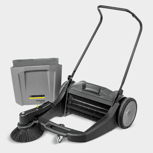KM 70/15 C выделяется из модельного ряда, за счет привода основной роликовой щетки с помощью 2 колес. Преимуществом этой модели, является прямой привод и отличные результаты очистки при движении по кривой траектории. Даже когда очистка производится в углу и одно колесо стоит на месте, работа основной щетки обеспечивается за счет второго колеса, двигающегося по внешней траектории. С помощью этой особенности, машина обеспечивает хорошее качество уборки как в правом, так и в левом углу. Высота боковой щетки регулируется в четырех положениях. Машина весом всего лишь 20 кг. Работает по принципу совка: с небольшим усилием, грязь транспортируется в 40 л. контейнер для грязи, который находится перед основной роликовой щеткой. Без надобности, боковая щетка может быть поднята над землей. В таком случае вы избегаете образования лишней пыли при работе.